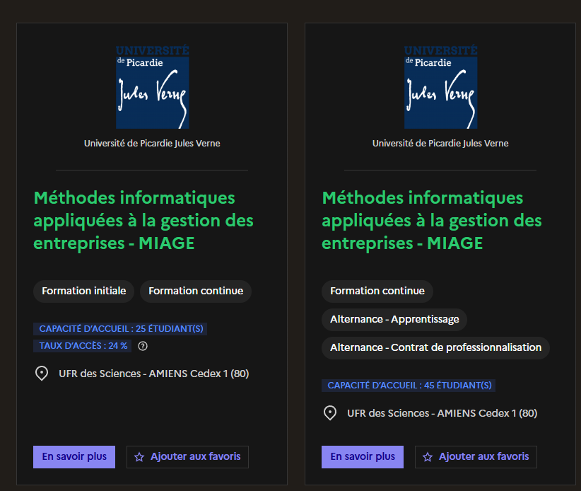 Le dispositif eMIAGE offre quant à lui une réponse aux attentes d’un public éloigné des centres de formation en France ou à l’étranger. Formation initiale (ayant validé un BAC+3 en informatique) ou continue, vous ne pouvez pas vous déplacer pour suivre votre formation en présence ? Le site d’Amiens vous propose de suivre votre Master MIAGE à distance. Plus d’informations